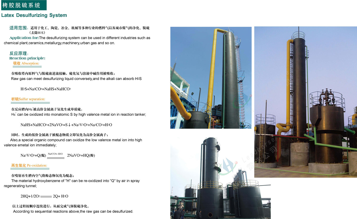 適用范圍:適用于化工、陶瓷、冶金、機械等多種行業(yè)的燃料氣以及城市煤氣的凈化、脫硫(去除H2S) 反應(yīng)原理:(1)吸收:在吸收塔內(nèi)原料氣與脫硫液逆流接觸,硫化氫與溶液中堿作用被吸收;H2S+Na2CO3=NaHS+NaHCO3 (2)析硫:在反應(yīng)槽內(nèi)Hs被高價金屬離子氧化成為單質(zhì)硫;NaHS+NaHCO3+2NaVO3=S↓+Na2V2O5+Na2CO3+H2O同時,生成的低價金屬離子被醌態(tài)物質(zhì)立即氧 化為高價金屬離子;Na2V2O5+Q(醌)NaCO3+H2O 2NaVO3+HQ(酚) 再生氧化:在噴射再生槽內(nèi)空氣將酚態(tài)物氧化為醌態(tài);2HQ+1/2O2 2Q+H2O 以上為過程按順序連續(xù)進(jìn)行,從而完成氣體脫硫凈化。